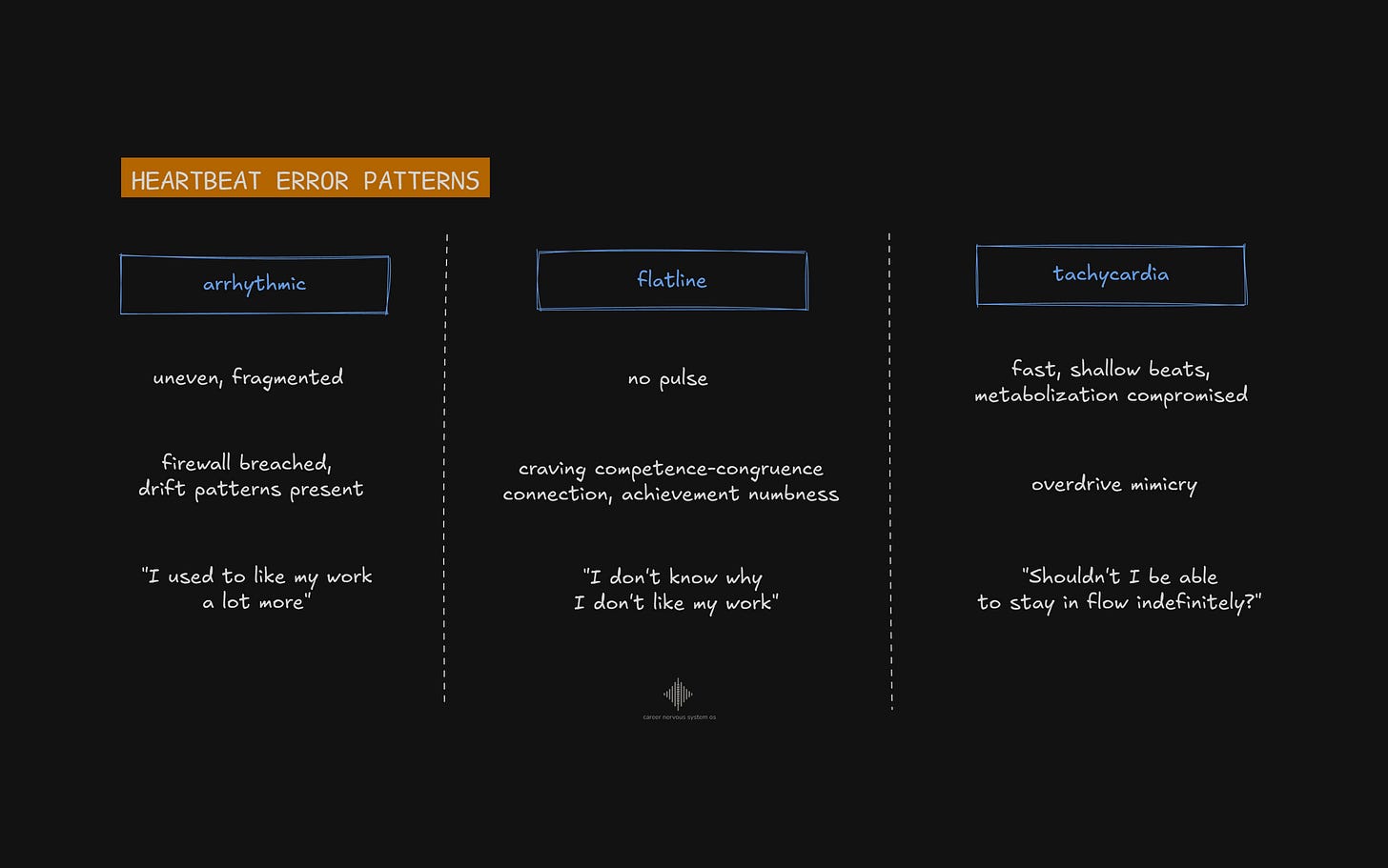 Maps the most common failure modes of a fractured Heartbeat. These patterns emerge when the pulse between build and engage is compromised, and the nervous system can no longer metabolize output into congruence.