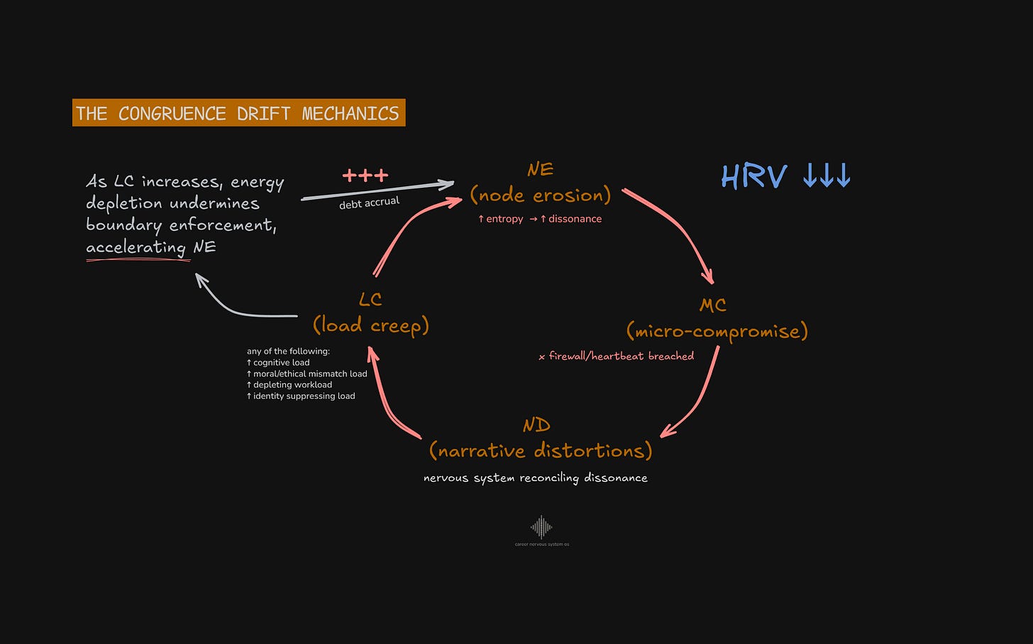 Maps the systemic architecture behind congruence degradation. This loop reveals how internal dissonance compounds gradually, until the individual’s output no longer reflects their identity.