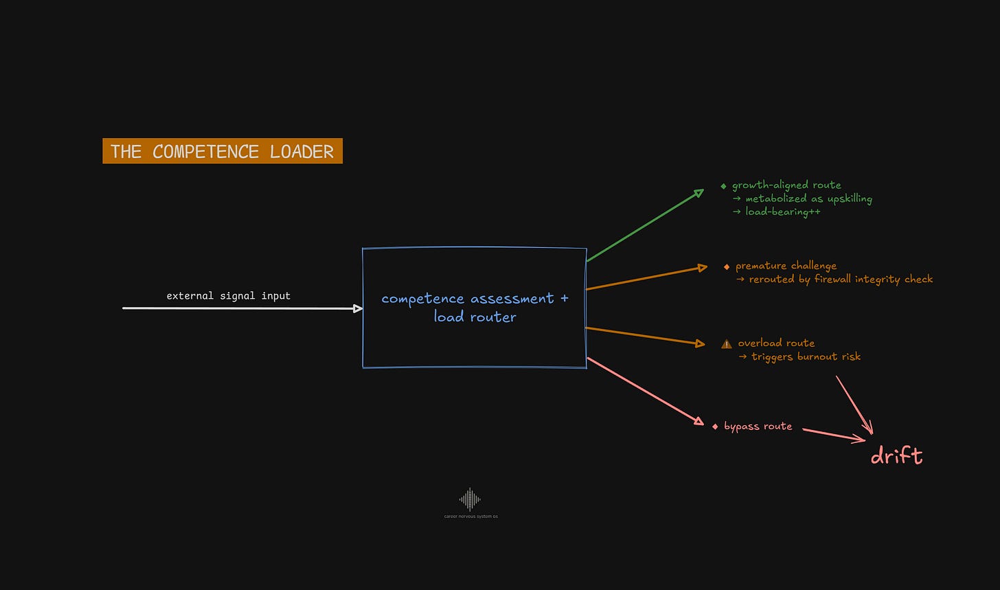 The Competence Loader is a signal-processing mechanism that evaluates incoming stimuli against an individual's skill stack, nervous system bandwidth, and current metabolization state.